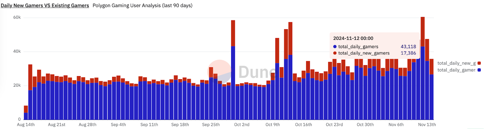 Daily new users for games on Polygon PoS hit 17.4K on Nov. 12, a 90-day high for the ecosystem (shown below)