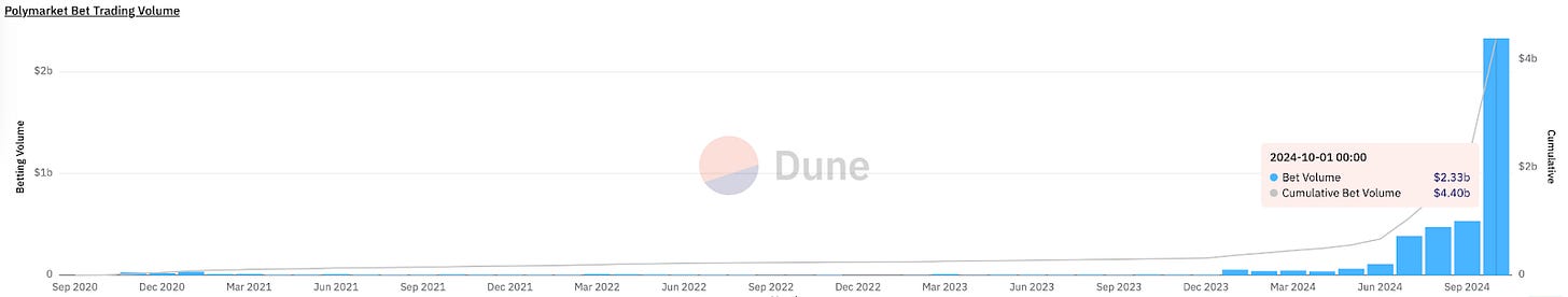 Polymarket volume hit $2.33B during the month of October (chart below)