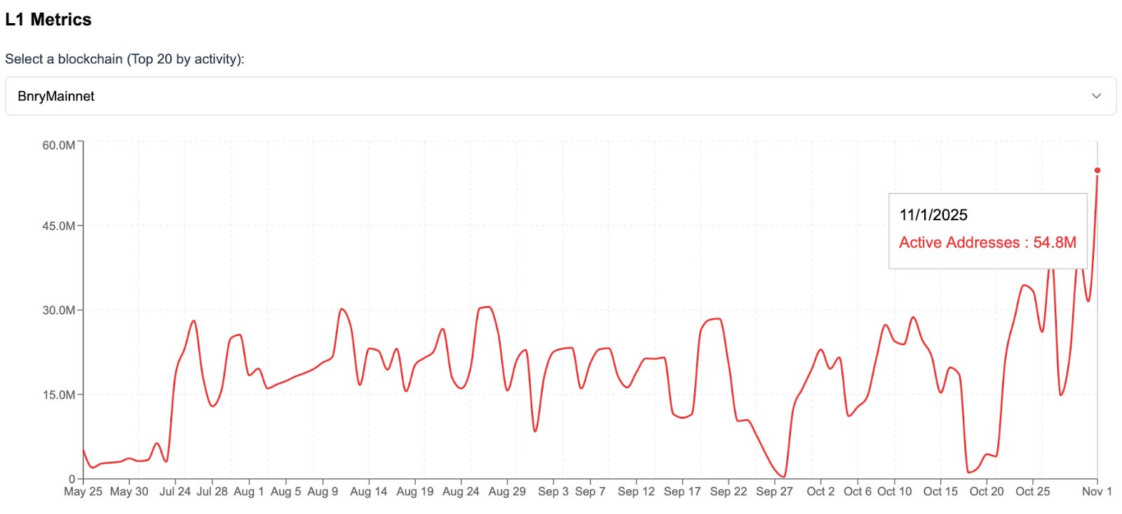 Bnry’s Avalanche L1 saw an all-time high of 54.8M active addresses on Nov. 1