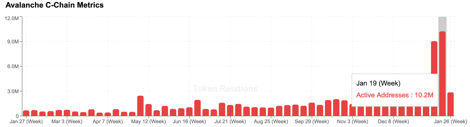 Active addresses on the Avalanche C-Chain reached a new weekly high of 10.2M last week.
