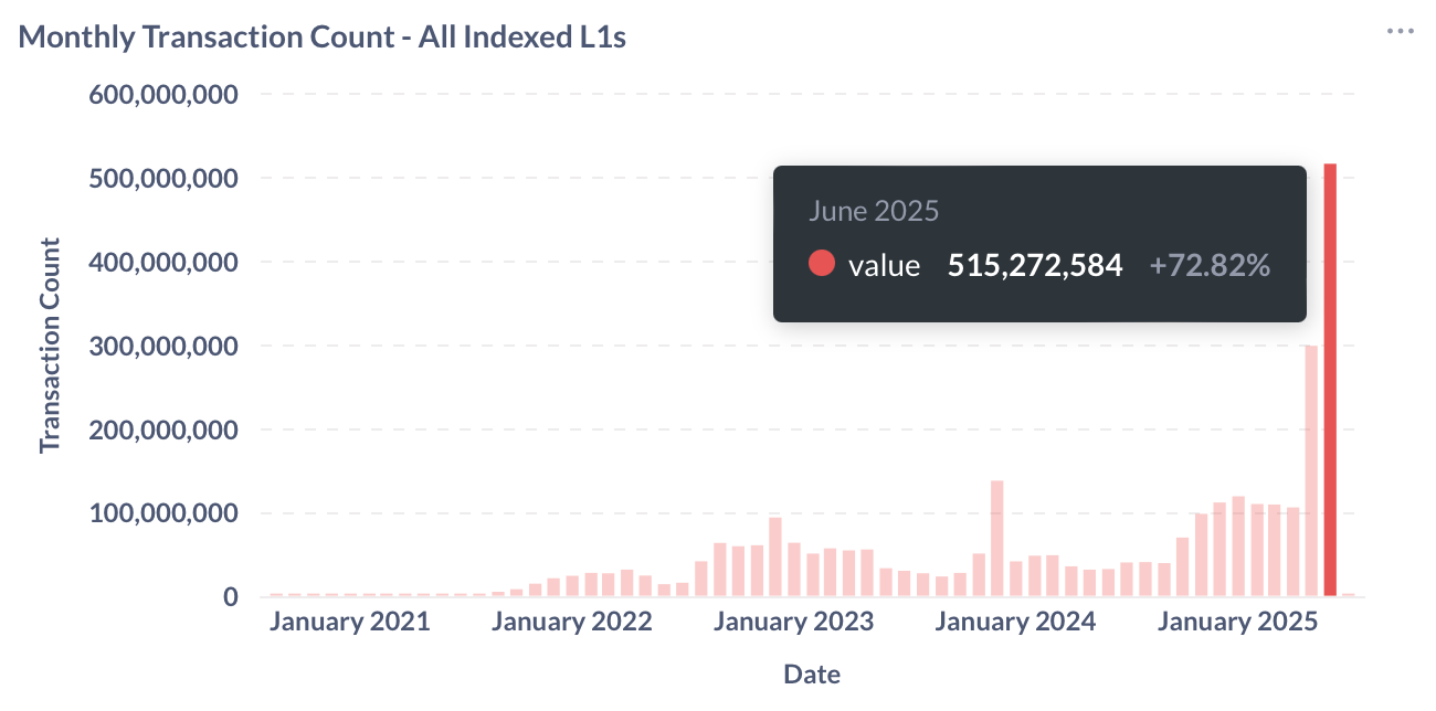 🔺What we’re watching: Avalanche just marked its best performing month by transaction count, with 515.3 million transactions processed across its indexed layer-1 (L1) blockchains, onchain data shows.