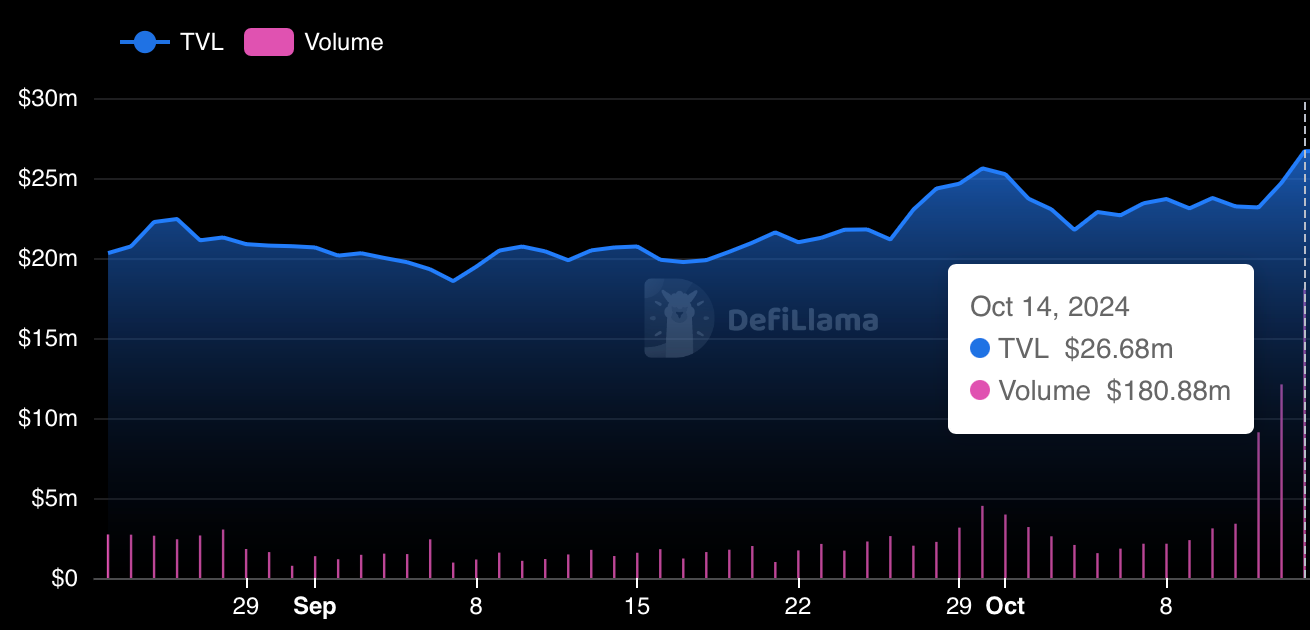 Dexalot, a DEX built on Avalanche, hit all-time highs of $26.7M in TVL and $181M in daily volume (shown below)