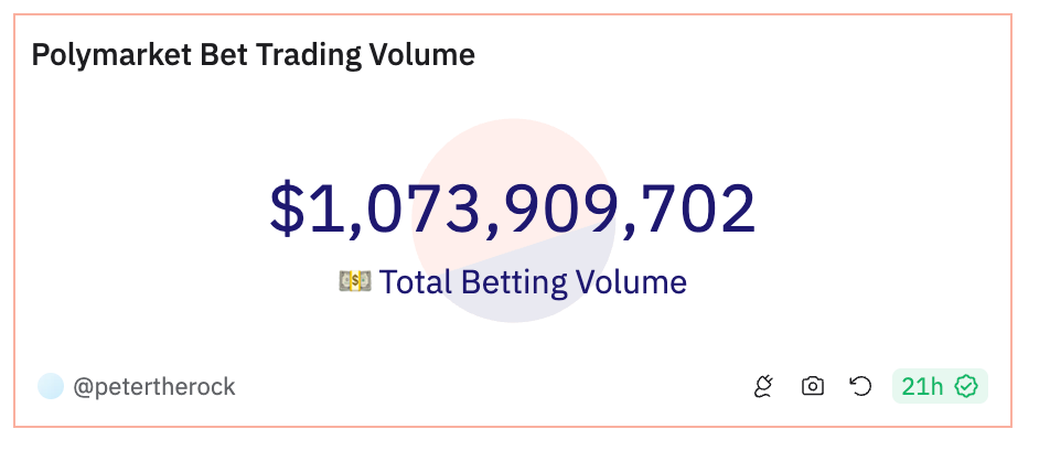 Polymarket, a web3 prediction market on Polygon PoS, processed $1B worth of volume reported by Dune Analytics user petertherock (shown below)