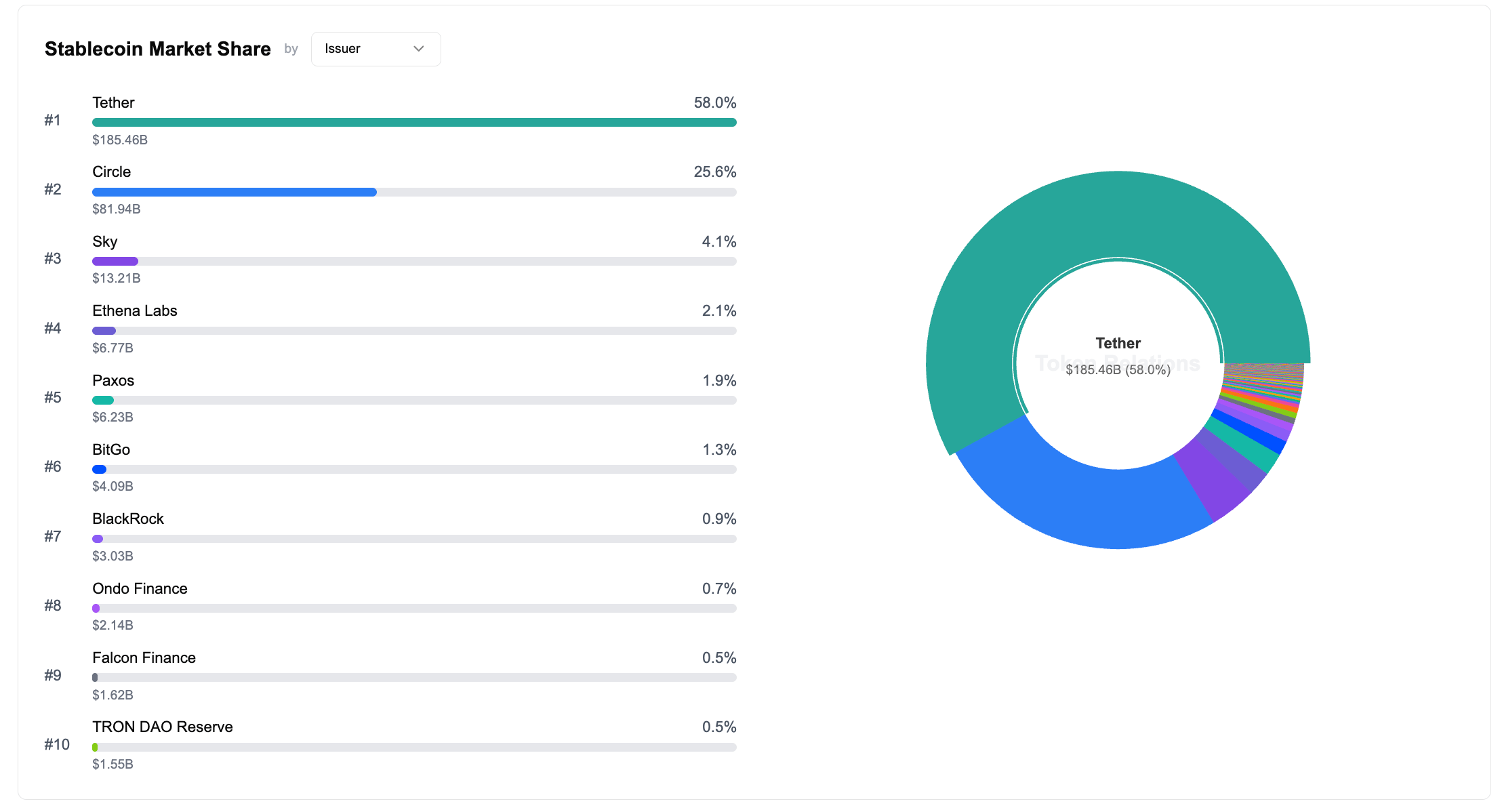 Market & Issuers: The Stablecoin Dashboard expands on top-line supply metrics by providing granular visibility into onchain capital allocation. It maps exact asset distribution across centralized exchanges, cross-chain bridges, DEX liquidity pools and lending protocols. Features include daily mint and redemption tracking, issuer market share, and precise volume breakdowns for entities such as Tether, Circle, Paxos, and more.