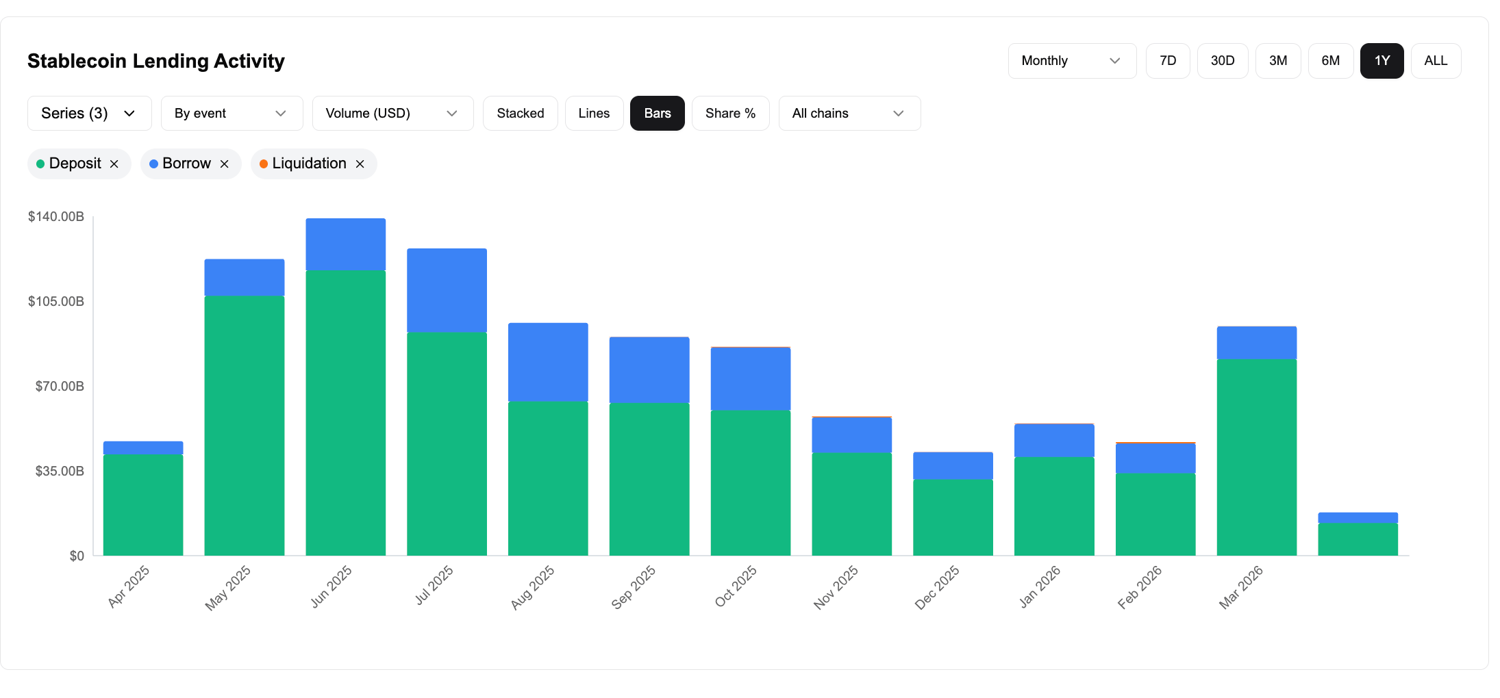 Lending & Payments: The Dashboard tracks the active deployment and utility of stablecoin capital. This includes measuring DeFi lending and credit dynamics spanning deposit, borrow, and liquidation volumes across Aave and Morpho, which collectively processed over $100B in stablecoin deposits in March 2026. For payments, we monitor active commercial entities and transaction volumes across fintechs and cross-border payment protocols to quantify real-world adoption.