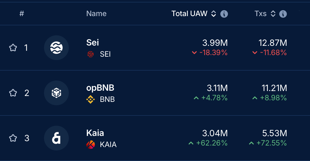 Meanwhile, as Sei has made integrations that appeal to developers, the network is seeing increased activity on the user side, as it has ranked first this week for unique active wallets on EVM chains at 4 million. The chain also ranked second in dApp transactions in the same time period at 12.87 million.