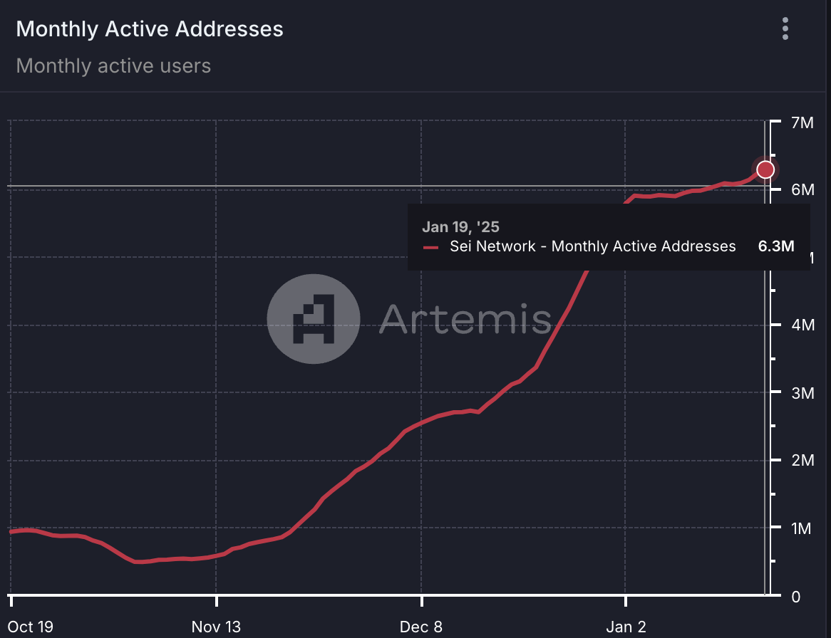 💨 What’s happening: The Sei Network hit 6.3 million monthly active addresses on Jan 17 and is up 570% compared to Q4 2024, according to Artemis onchain data.