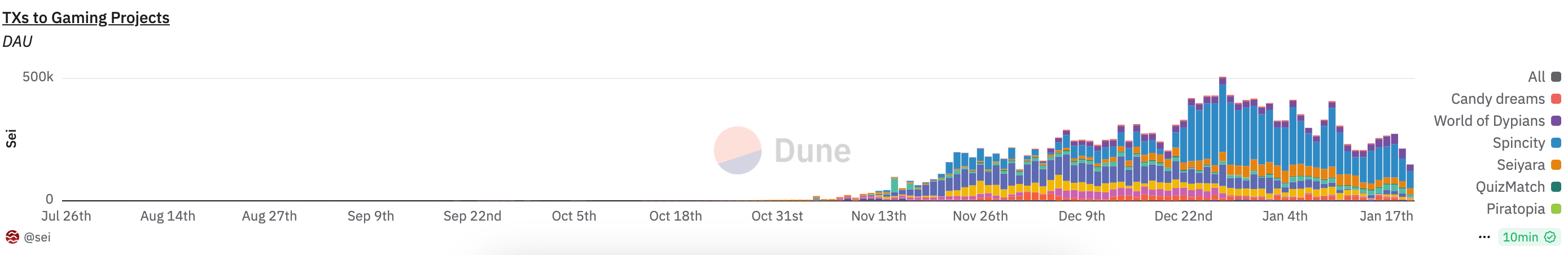 Since Sei Network prioritizes community and gaming, as assumed from their creator fund initiative, a high active address metric is just as attractive. It’s important to keep in mind that in order to play web3 games, a user would have to create a new address - meaning a user can be equated to an address. This added context is relevant because gaming projects on the Sei Network have been on a rise, seeing an increase from 64,000 to 240,000 daily transactions from active users from November to January.