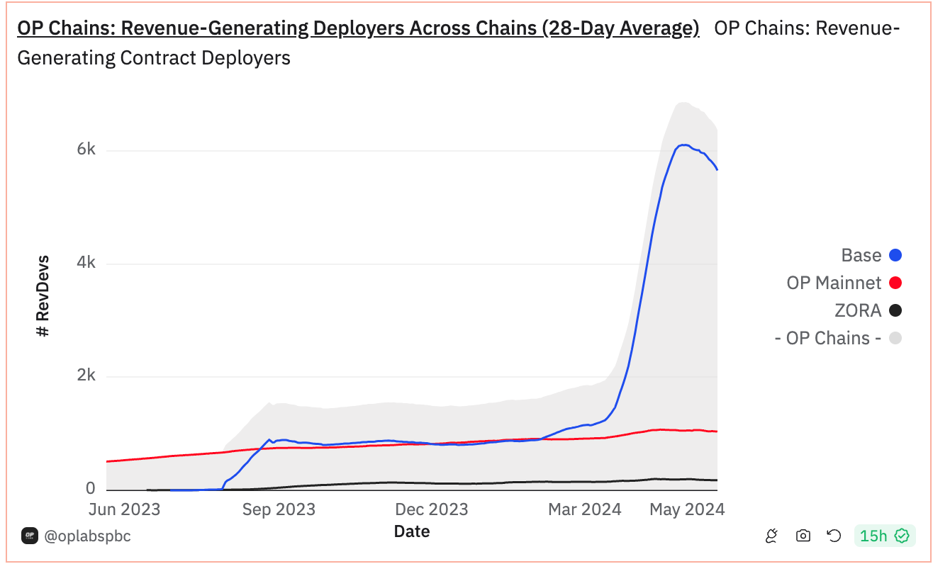 ⚡What’s happening: The Superchain is seeing increased developer and user interest with over 4 million daily transactions during April and May and its total number of revenue-generating developers up about 10% month-over-month, according to an X post by Optimism. Base has 5,660 revenue-generating deployers and OP Mainnet has over 1,000, OPLabs data on Dune showed.
