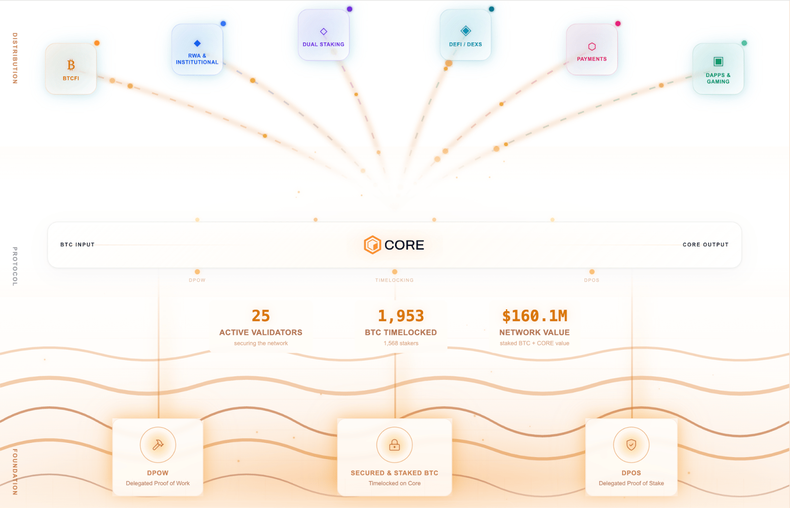 Core leverages Bitcoin’s network to further segment the power grid into a three-layer architecture: Foundation, Protocol, and Distribution. These layers are secured by three consensus mechanisms: Delegated Proof of Work (borrowing Bitcoin miners' hashpower), non-custodial bitcoin timelocking, and Delegated Proof of Stake (CORE token staker-driven validator selection).