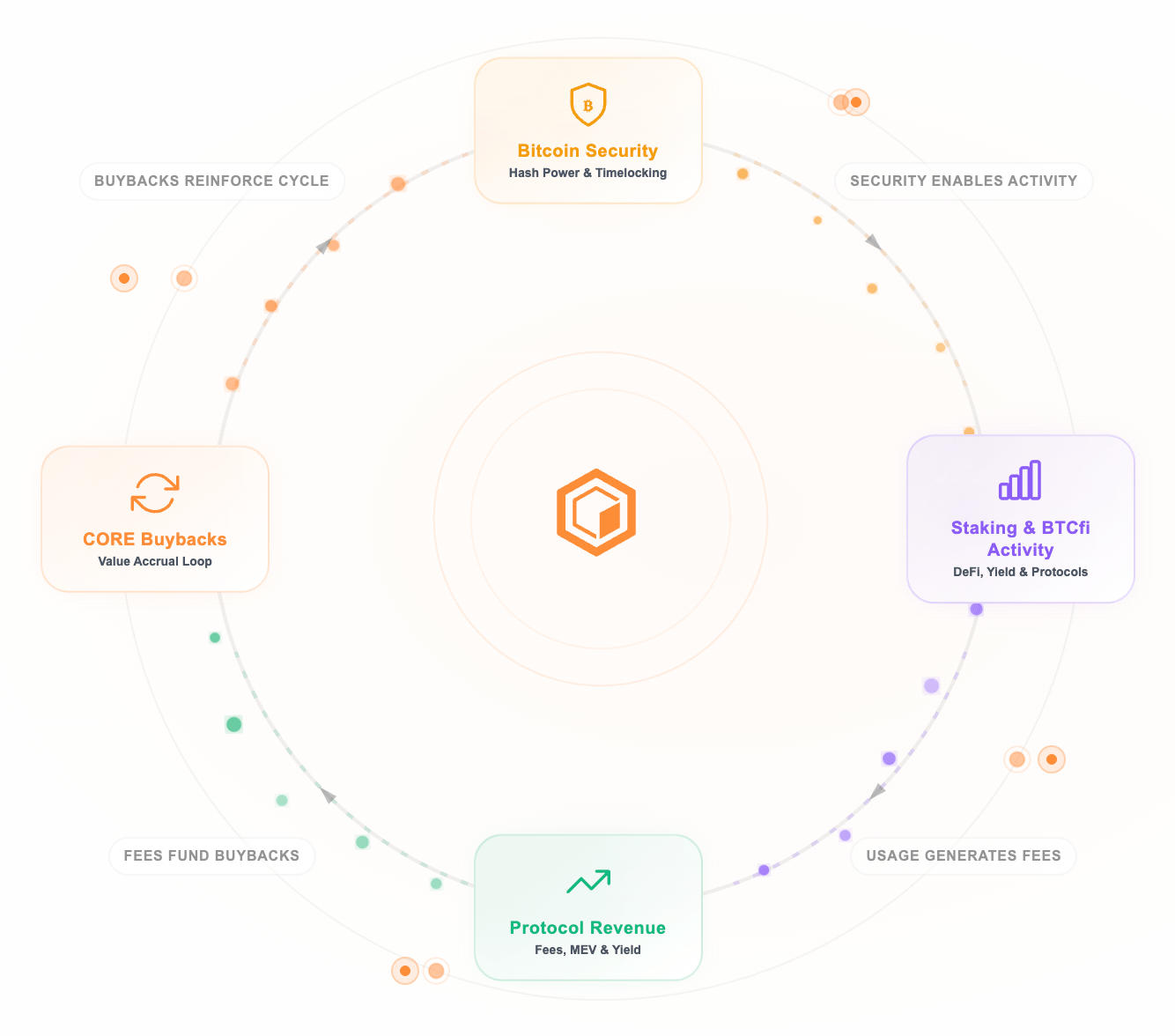 Core’s revenue flywheel operates across four stages. Bitcoin security (hashpower and timelocking) enables onchain activity; that activity drives staking and BTCFi usage across DeFi, yield, and protocols. The usage then generates protocol revenue through fees, MEV, and yield; and that revenue funds CORE token buybacks, which reinforce the security layer and restart the cycle.