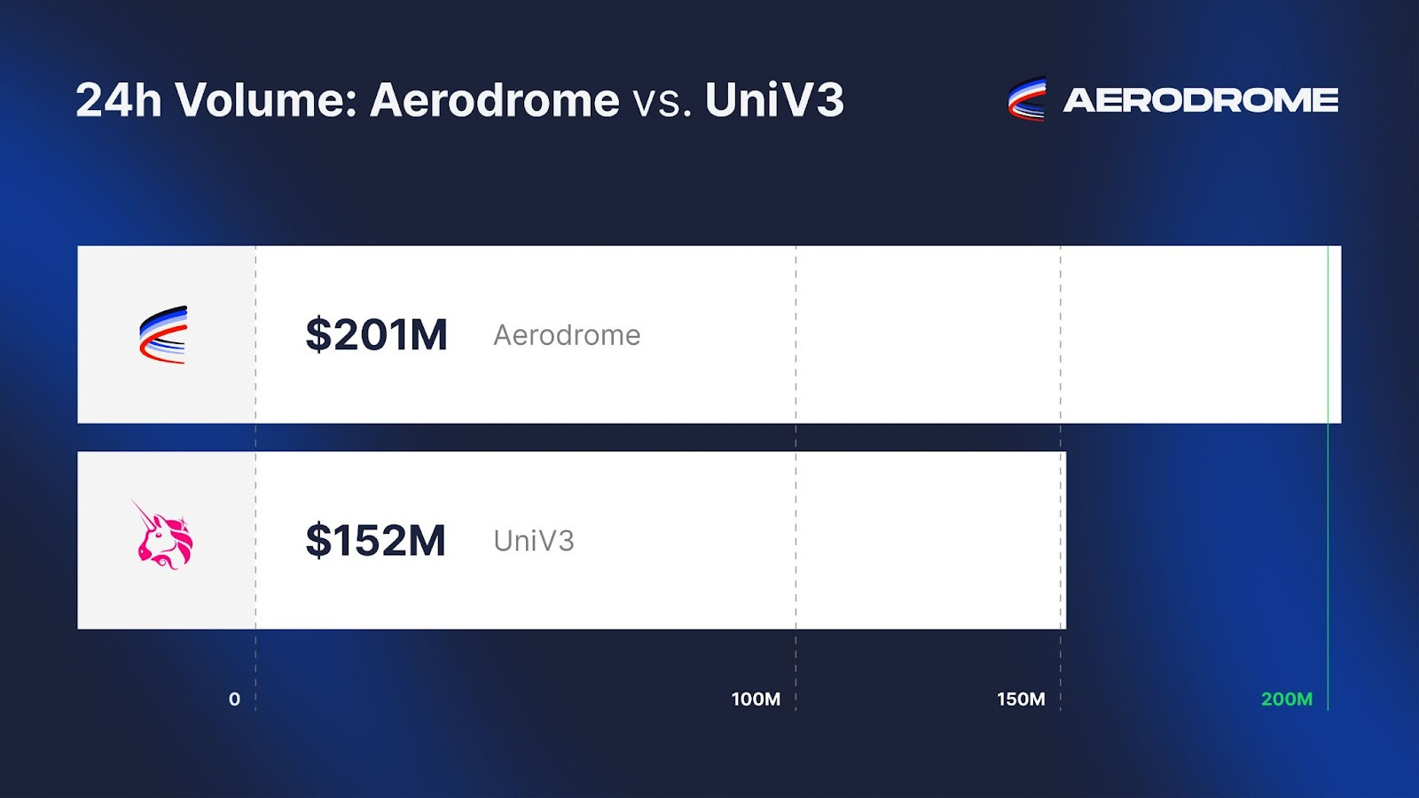 Aerodrome, a trading and liquidity marketplace on Base, flipped Uniswap’s UniV3 on Base, making it the primary volume hub for the chain at $201M (chart below)